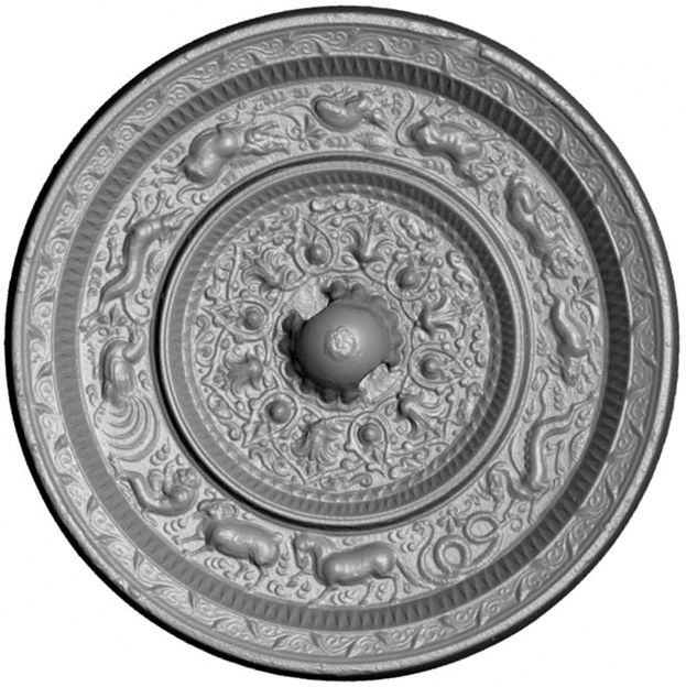 西方から伝えられたパルメット唐草紋が美しい鏡。その周りには東アジアに広がる十二支が動物の姿で表されている。犬をはじめ、活き活きと躍動的な動物たちが楽しい鏡。