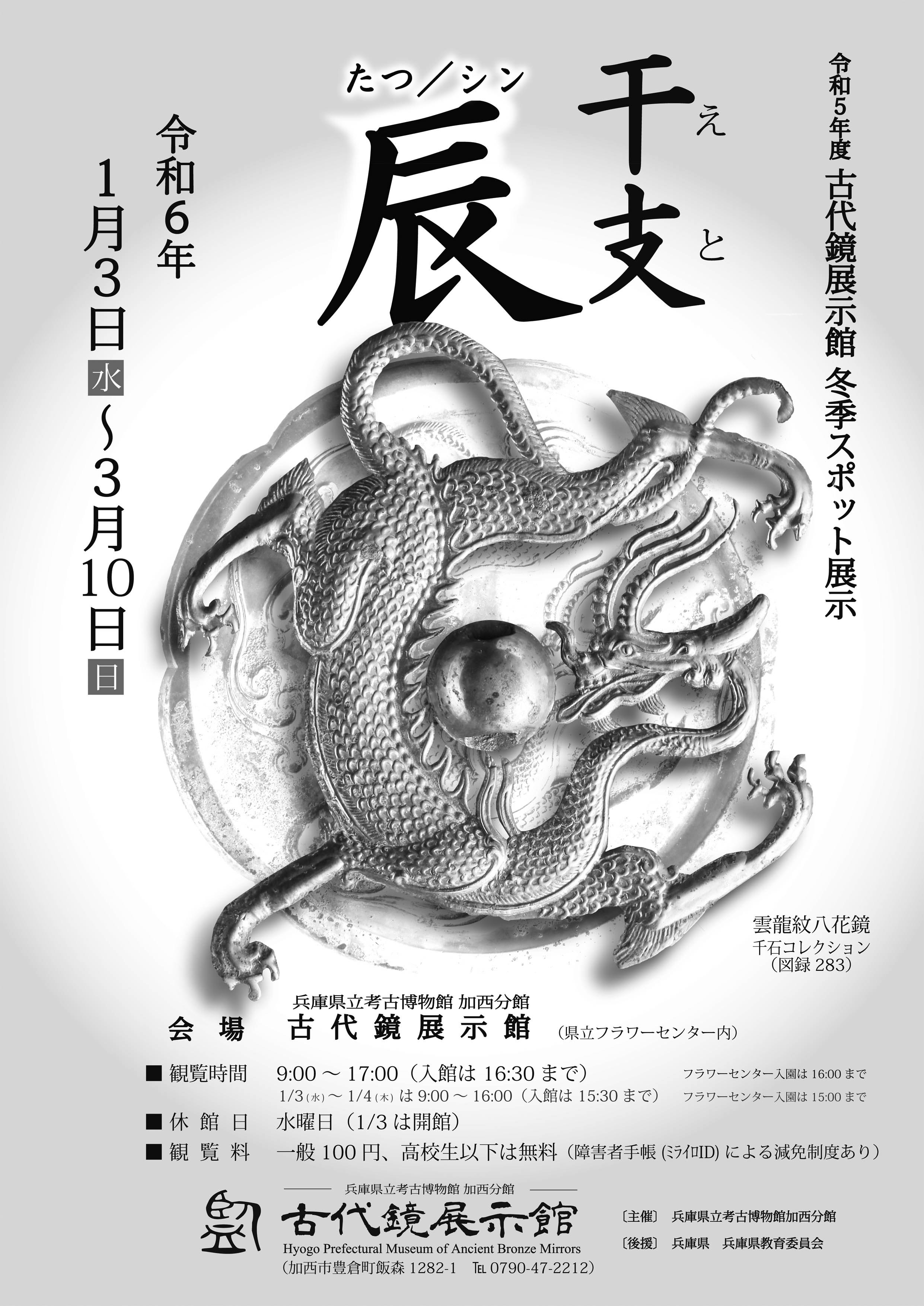 令和6年の干支(えと)は「辰・たつ」年にあたります。本展示では、辰(龍)の図像が表された鏡1面を展示するとともに、「干支」や「十二支」について紹介します。