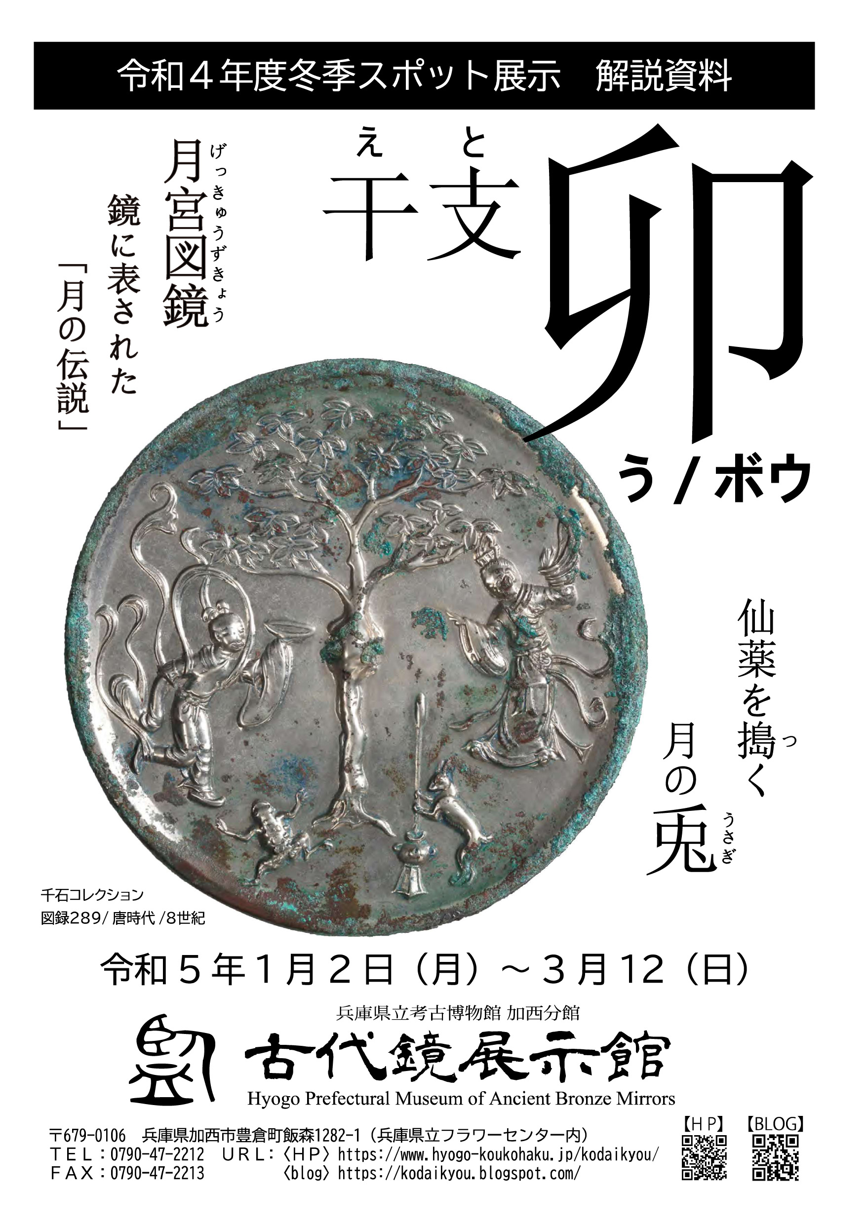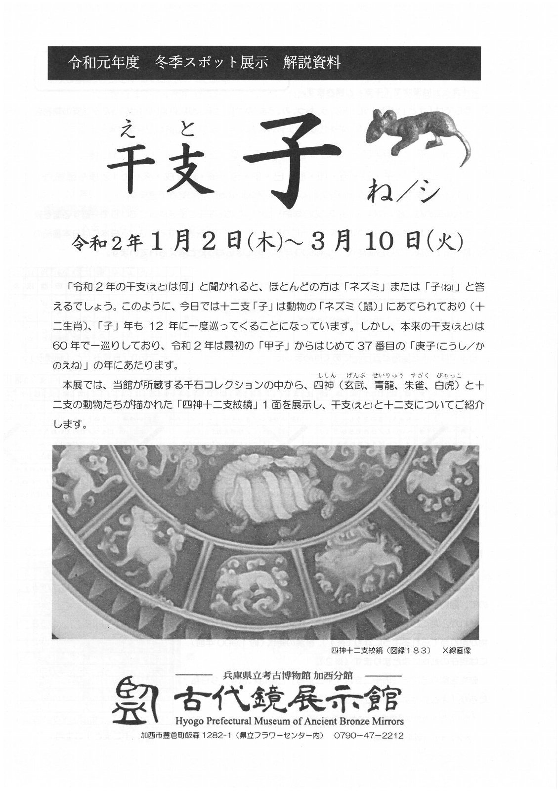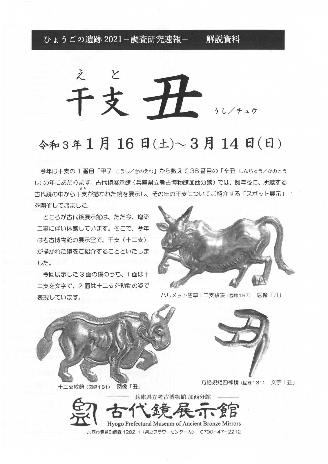 新展示室増築工事に伴う休館のため、本館(兵庫県播磨町)で開催した「干支 丑」展の解説資料。十二支を文字と図像で表現した3面の鏡について紹介しています。