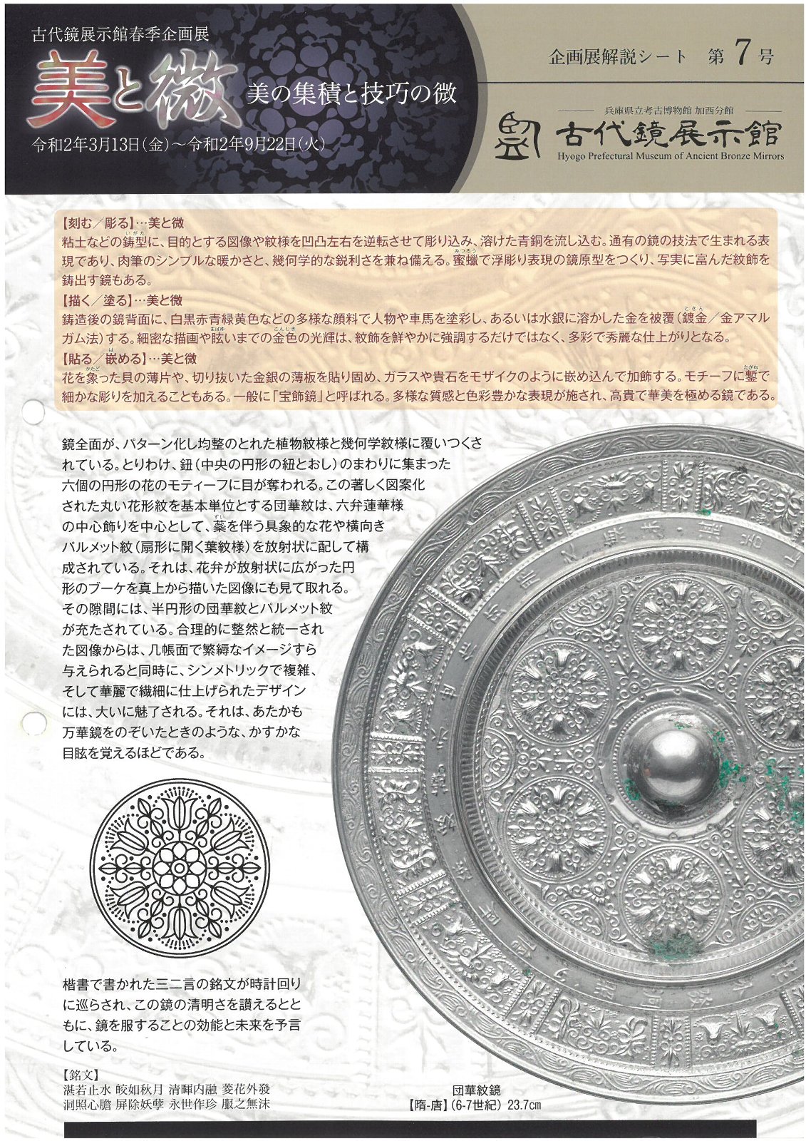 企画展をわかりやすく解説したシート。鏡背に見られる集約された「美」と技巧を極めた「微」が調和する銅鏡について紹介しています。