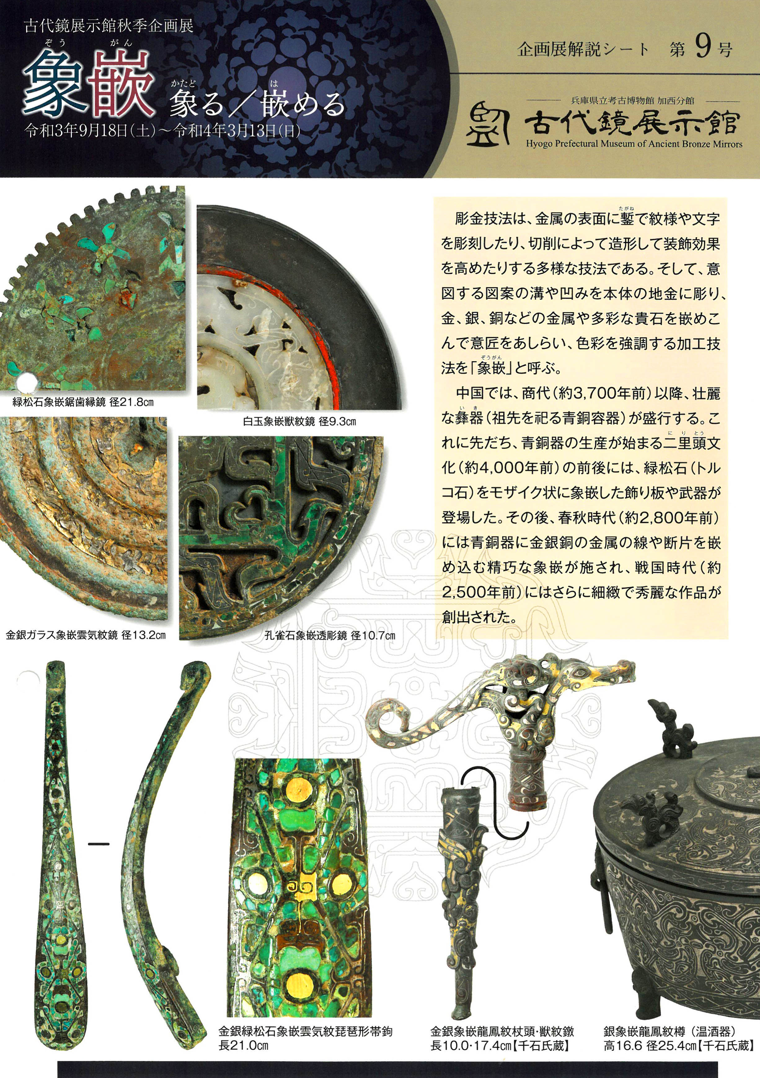 企画展をわかりやすく解説したシート。金銀などの金属や貴石をはめこんだ銅鏡や装身具などの作品の中から、漢代以前の象嵌作品を展示し、古代金属工芸の美と技を紹介しています。