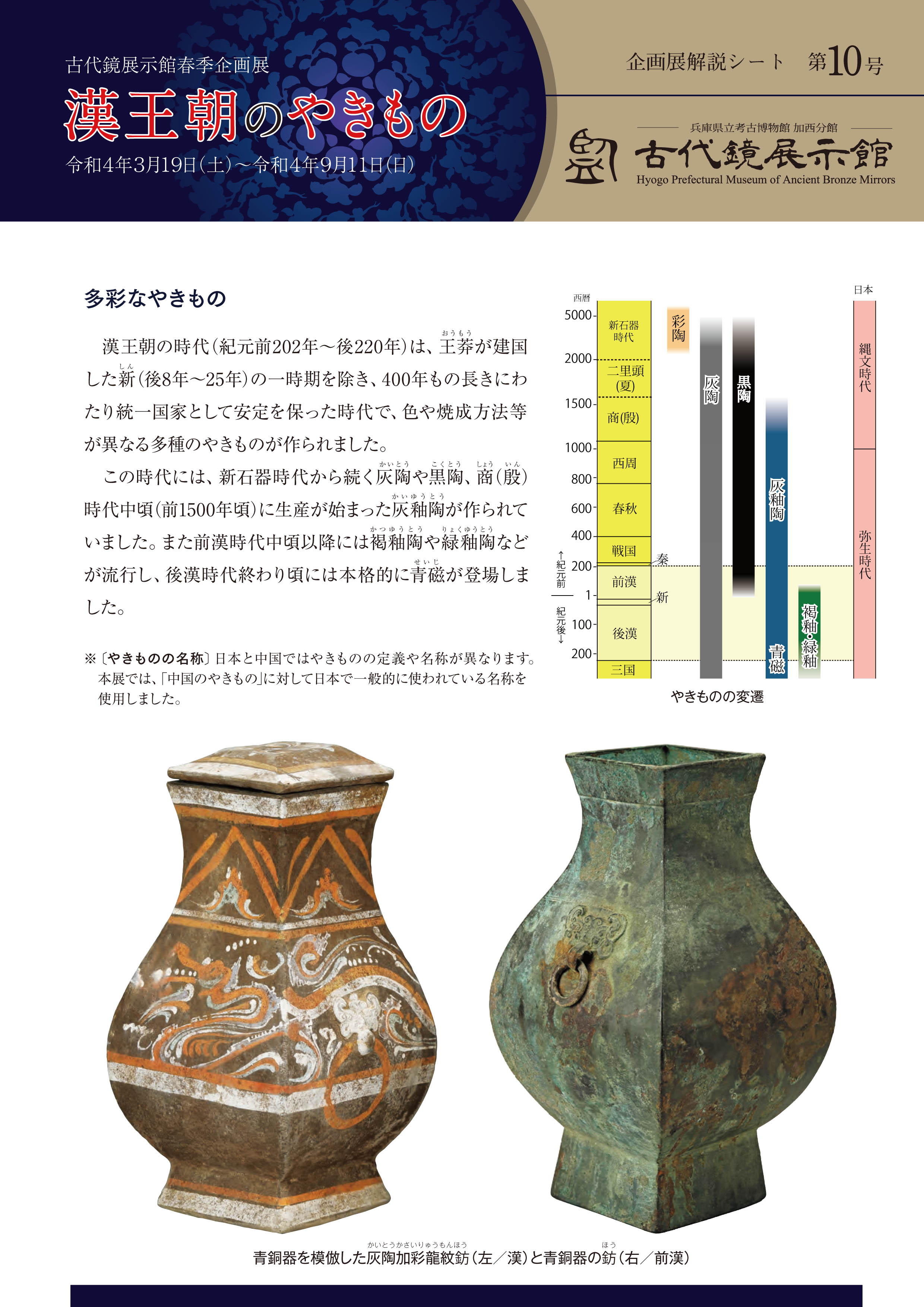 企画展をわかりやすく解説したシート。令和3年度に受贈した作品の中から、焼成や胎土、色や紋様などが異なる漢王朝時代のやきものを紹介しています。