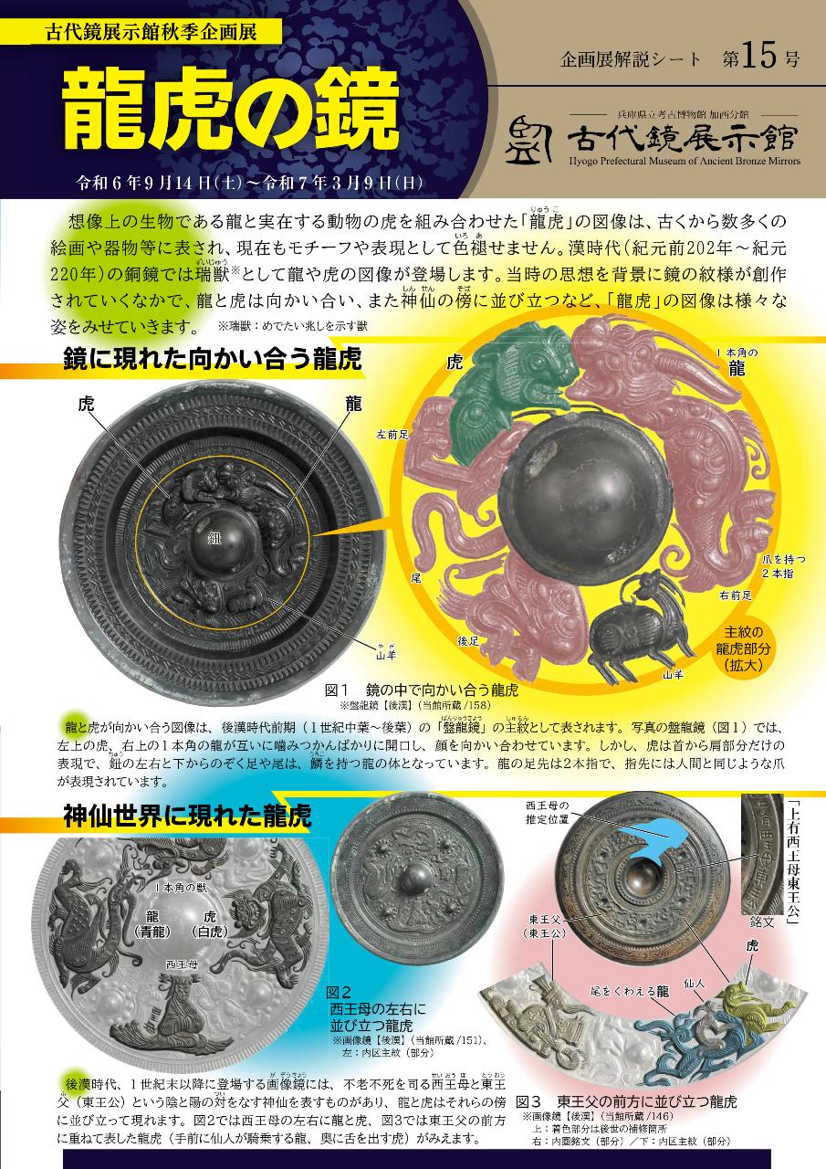 をわかりやすく解説したシート。当館が所蔵する龍と虎の画像を組み合わせた紋様が施された鏡を取り上げ、鏡における龍虎の様々な表現や関連文化について紹介しています。