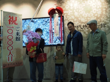 1万人目の方は姫路から来ていただいた一家4人で、記念品として当館からは図録やロゴマークのオーナメント、特製クリアーファイルを、県立フラワーセンターからはコチョウランを贈呈いたしました。