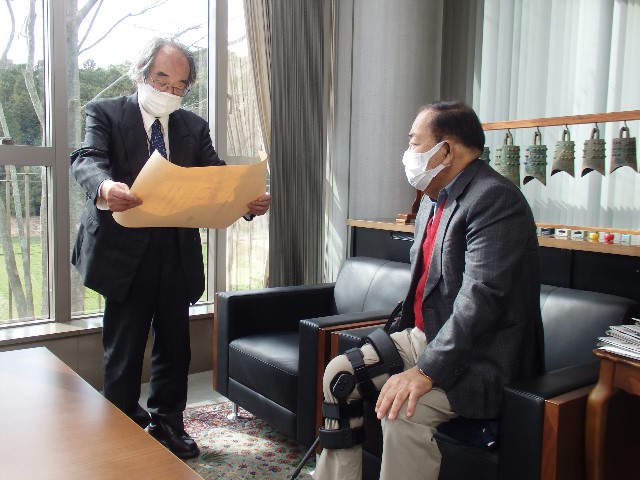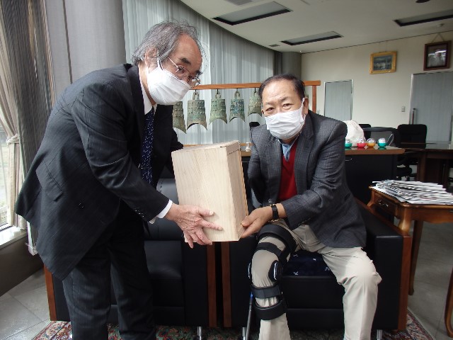 和田晴吾館長(左)から章記とともに記念品などが千石唯司氏(右)に手渡されました。(令和4年3月28日)
