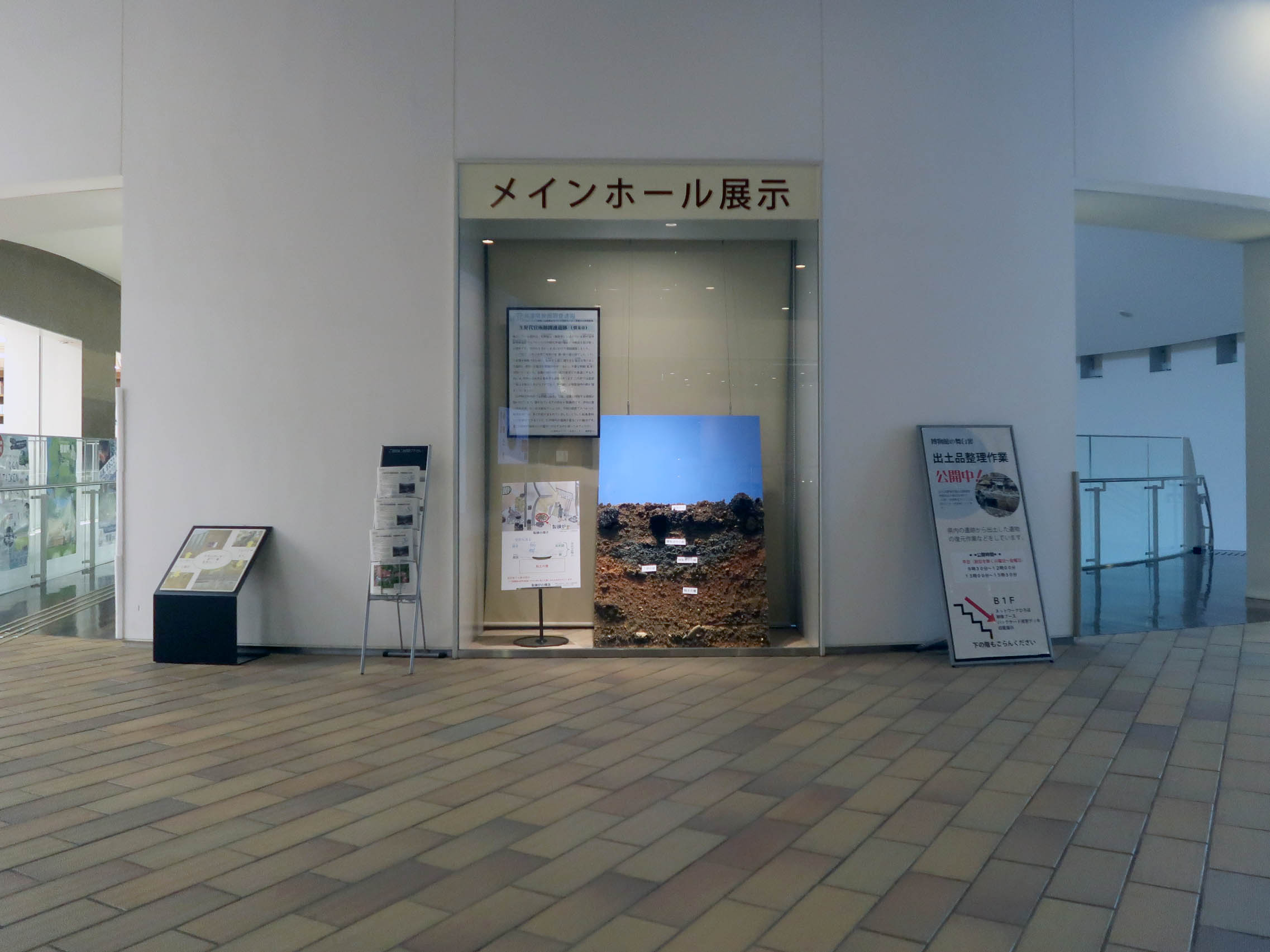 メインホールの展示ケースで最新の出土品や学芸員オススメの資料を展示しています。
