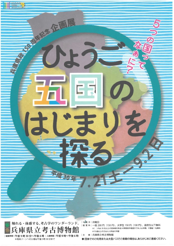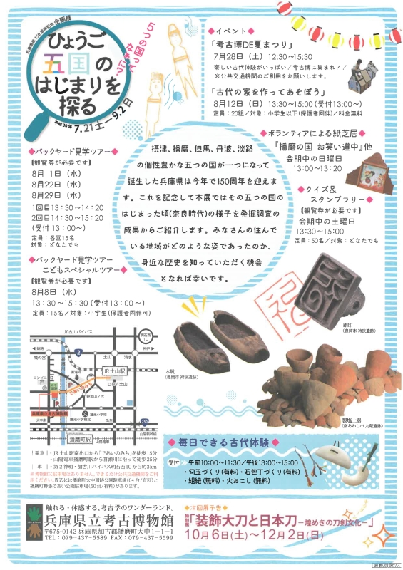 摂津、播磨、但馬、丹波、淡路の個性豊かな五つの国が一つになって誕生した兵庫県は今年で150周年を迎えます。これを記念して本展ではその五つの国のはじまった頃(奈良時代)の様子を発掘調査の成果からご照会します。