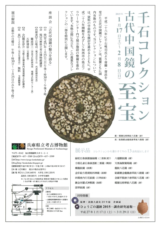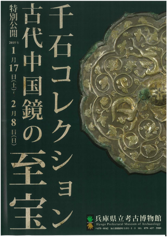 平成26年度に千石唯司氏より寄贈・寄託を受けた古代中国鏡コレクションは、質量ともに国内有数のものです。当コレクションについては、資料の学術的な検討を進めるとともに、平成28年開館をめざして加西市の県立フラワーセンター内で展示施設の整備を進めています。本格公開に先立ち、この貴重なコレクションの一部を特別に公開します。